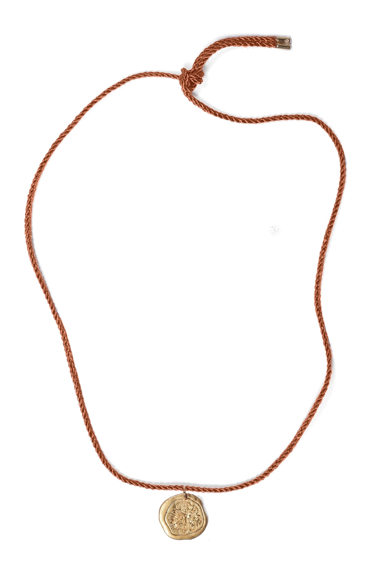 Terracotta silk cord adjustable necklace with 18k gold plated lemon slice shaped pendant and tie knot fastening.