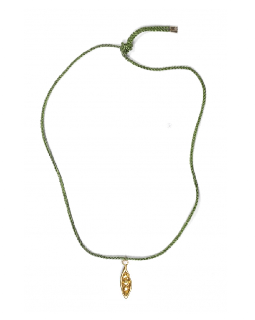Green silk cord adjustable necklace with 18k gold plated pea shaped pendant and tie knot fastening.