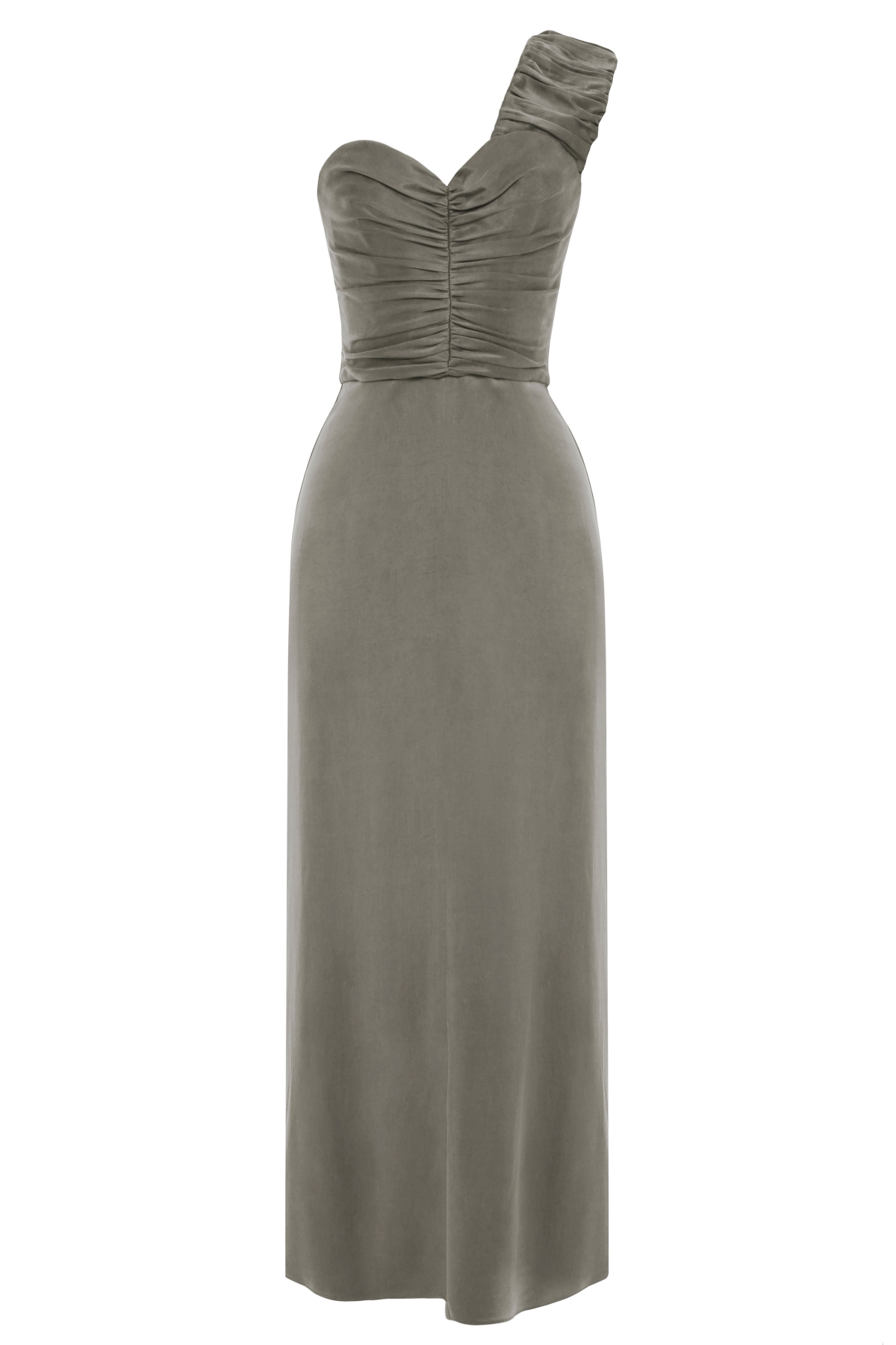 Designed to skilfully take you from day to night, Navy Blue Dress by 0711 is a beloved ladylike silhouette seen through contemporary lenses. Crafted from a sustainable cupro, the piece features back zip fastening along the midi length skirt, sweetheart neckline, ruched bodice and flirtatious one shoulder profile that epitomises effortless elegance, while subtly exuding playfulness at the same time.