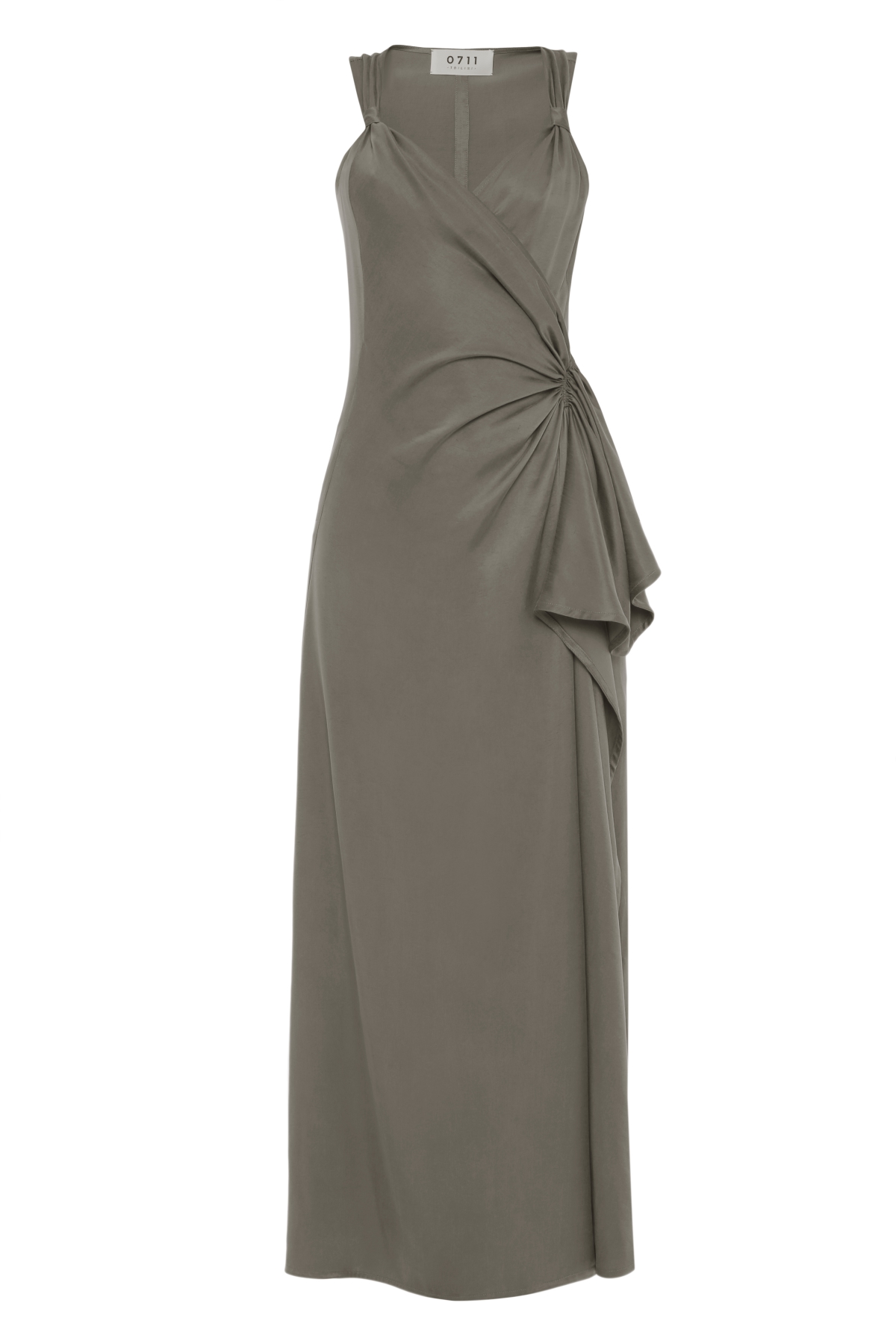 Combining novelty with a vintage-inspired wrap silhouette, 0711 Grey Midi Dress is a masterclass in modern romanticism. boasting sleeveless profile, the key feature of this piece is artfully draped waist which fastens with a magnetic snap. Apart from that, the number also stands out with frame-accentuating, cinched in slim fit which once again highlights the brand’s innate understanding of glamour and femininity.