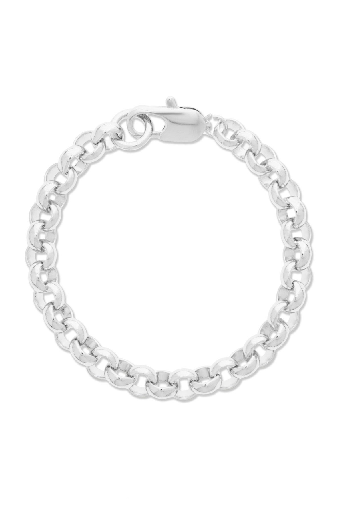 Silver Rolo Bracelet echoes Laura Lombardi’s love for chain silhouettes, which is deeply rooted in her childhood and jewelry pieces sold by the designer’s dad. This lobster claw fastened piece features hand interloped chain links that are cast from platinum-plated brass.