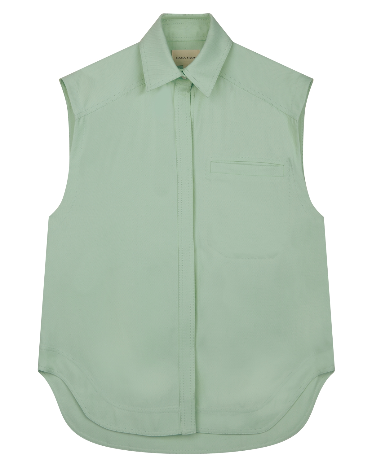 Loulou Studio's Aqua Sleeveless Maldo Shirt is designed to add a smart touch to your daily outfits in summer. The piece is cut for an oversized fit from linen enhanced twill for lightness and breathability and features a sharp collar along with a curved hem that will sit neatly over tapered pants or pair of jeans.