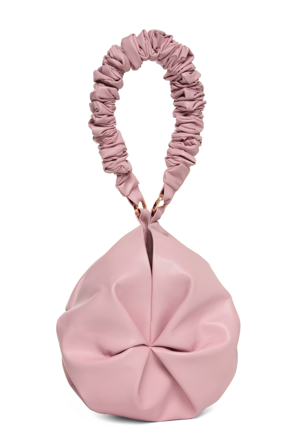 Oval shaped vegan leather tote with twisted handle, inside zip pocket and open top.
