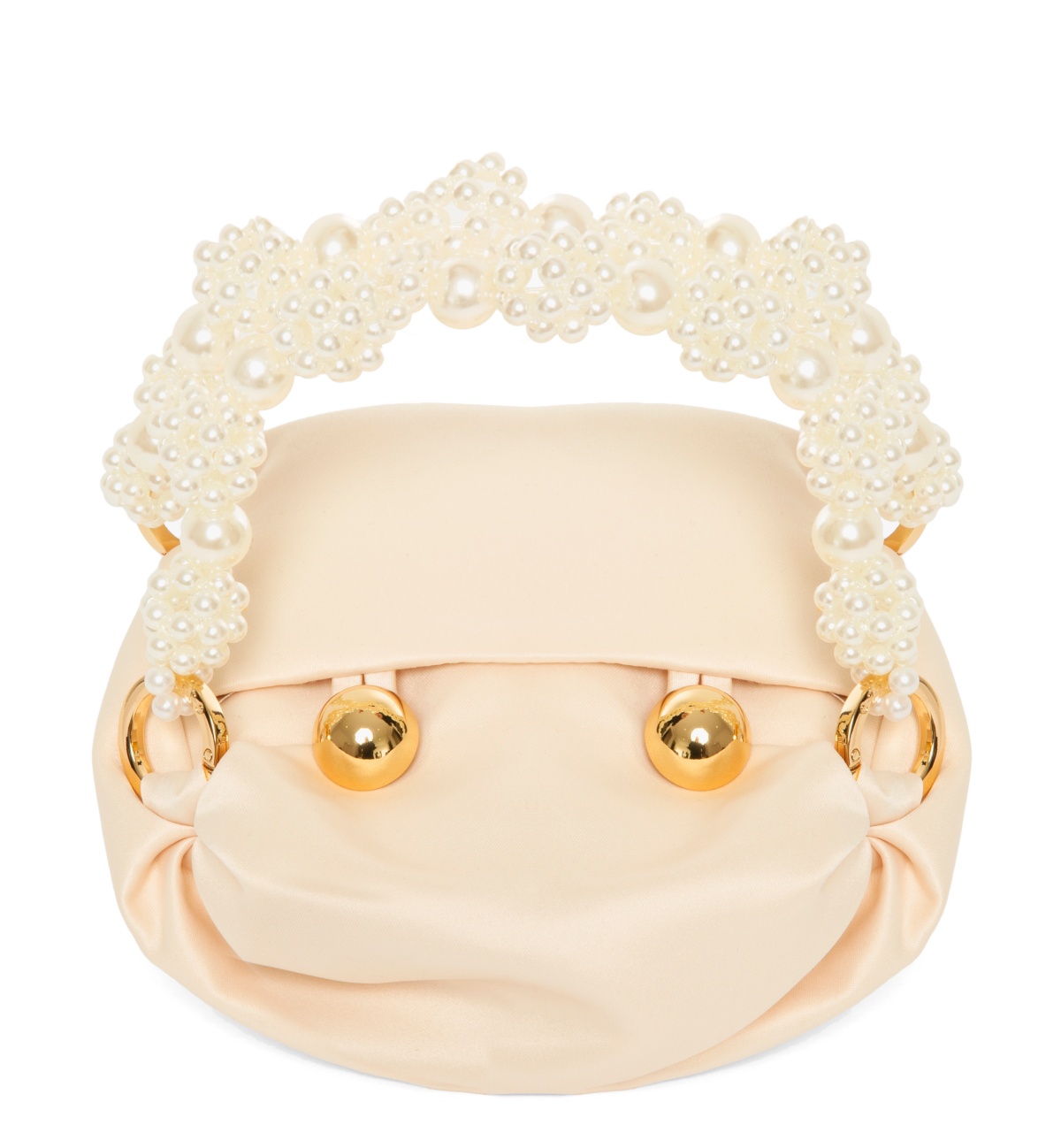 Silk-satin tiny tote with two button fastening and pearl beaded handles.