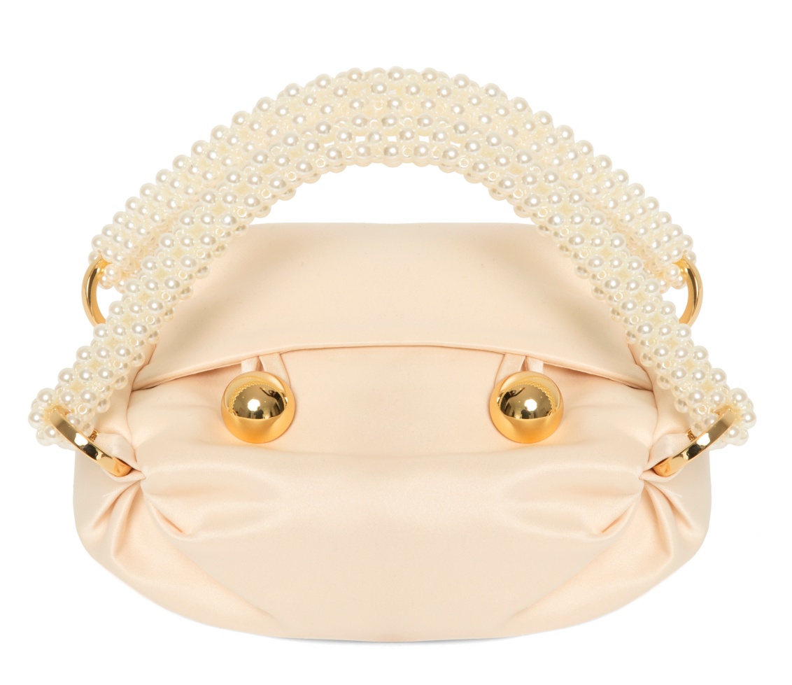 Silk-satin tiny tote with two button fastening and pearl beaded handles.