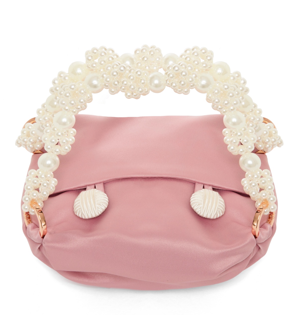 Silk-satin tiny tote with two button fastening and pearl beaded handles.