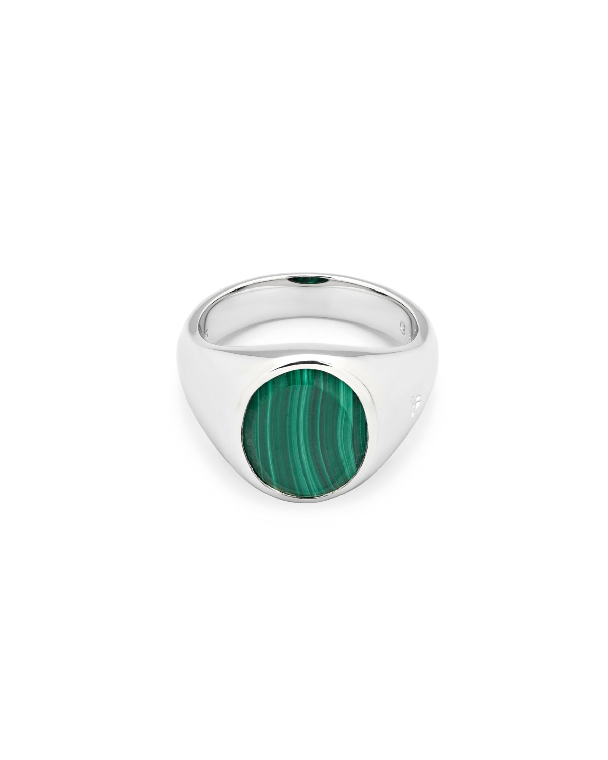 Lizzie Ring from Tom Wood is a medium-sized signet ring made of sterling silver, plated in white rhodium to strengthen the surface and prevent tarnishing. The ring comes with a custom-cut malacite handset in a sleek bezel to hold the stone.