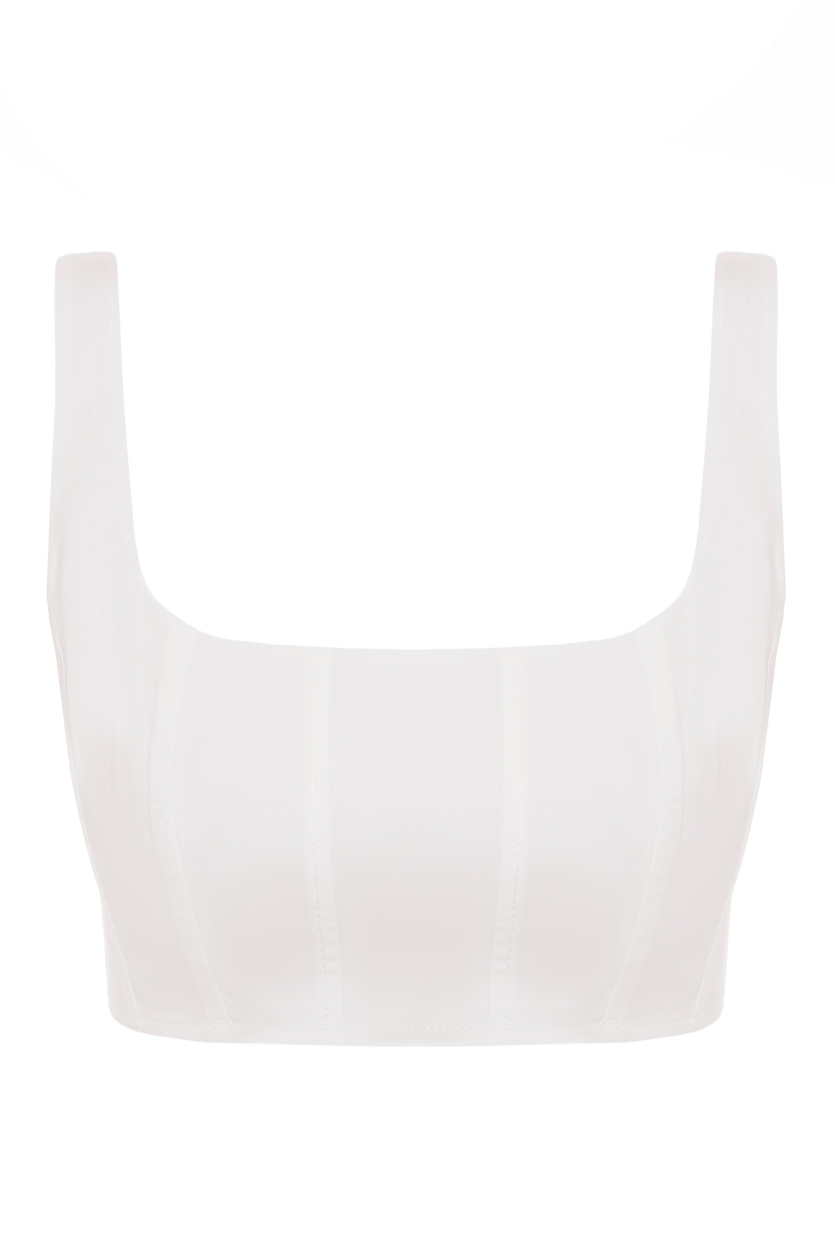 Perfect for sunny gateways, Staud's White Wells Cropped Top is cut from airy stretch cotton into a body-hugging silhouette. The piece offers corset-inspired paneling to maintain a structured profile and features lightweight construction along with a slim strap detailed square neckline.