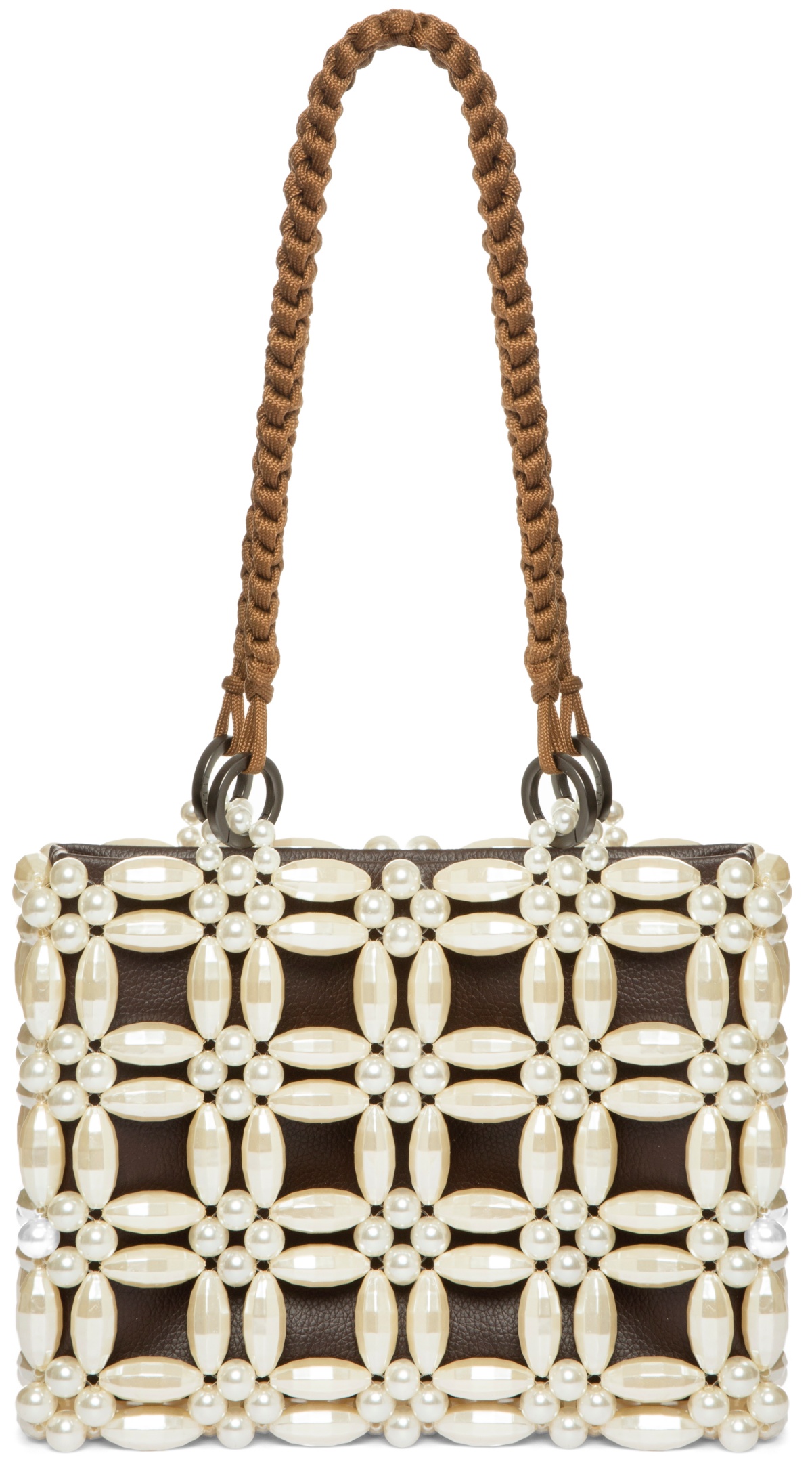In order to become more suitable for everyday use, the opulent pearl beaded construction of Marisha is toned down with practical design nuances such as paracord handles and removable vegan leather pouch that opens