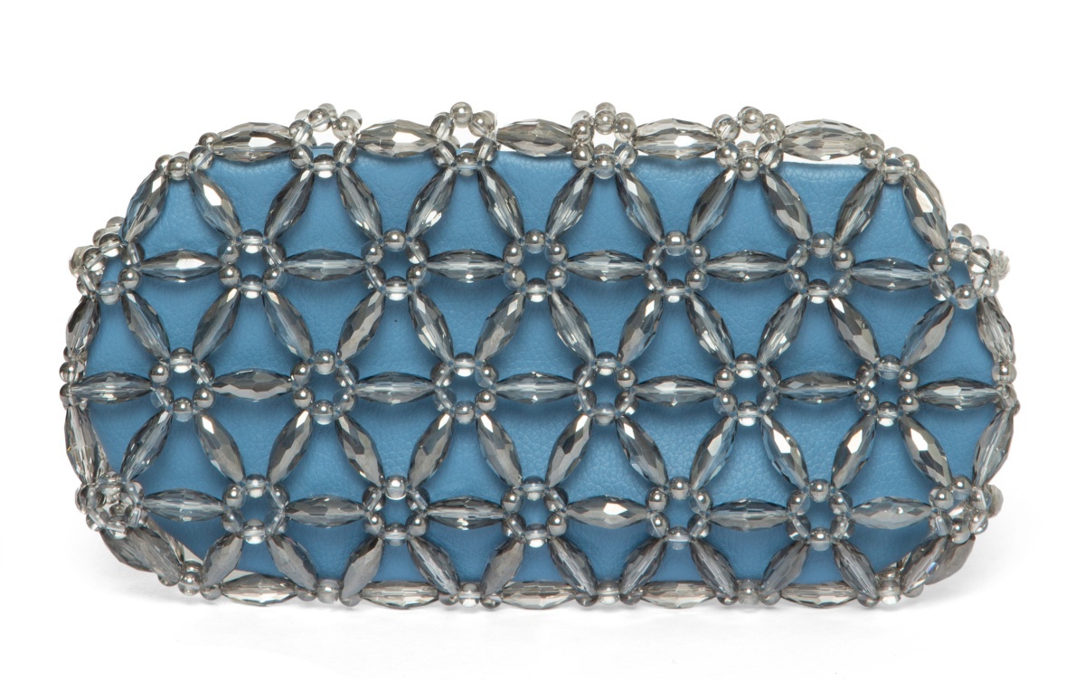 Hand assembled using glass-infused beads, Tebea clutch harmoniously brings together contrasting textures. Utterly glamourous essence of it is counterbalanced by magnet fastened vegan leather pouch that puts an edgy twist on the piece.