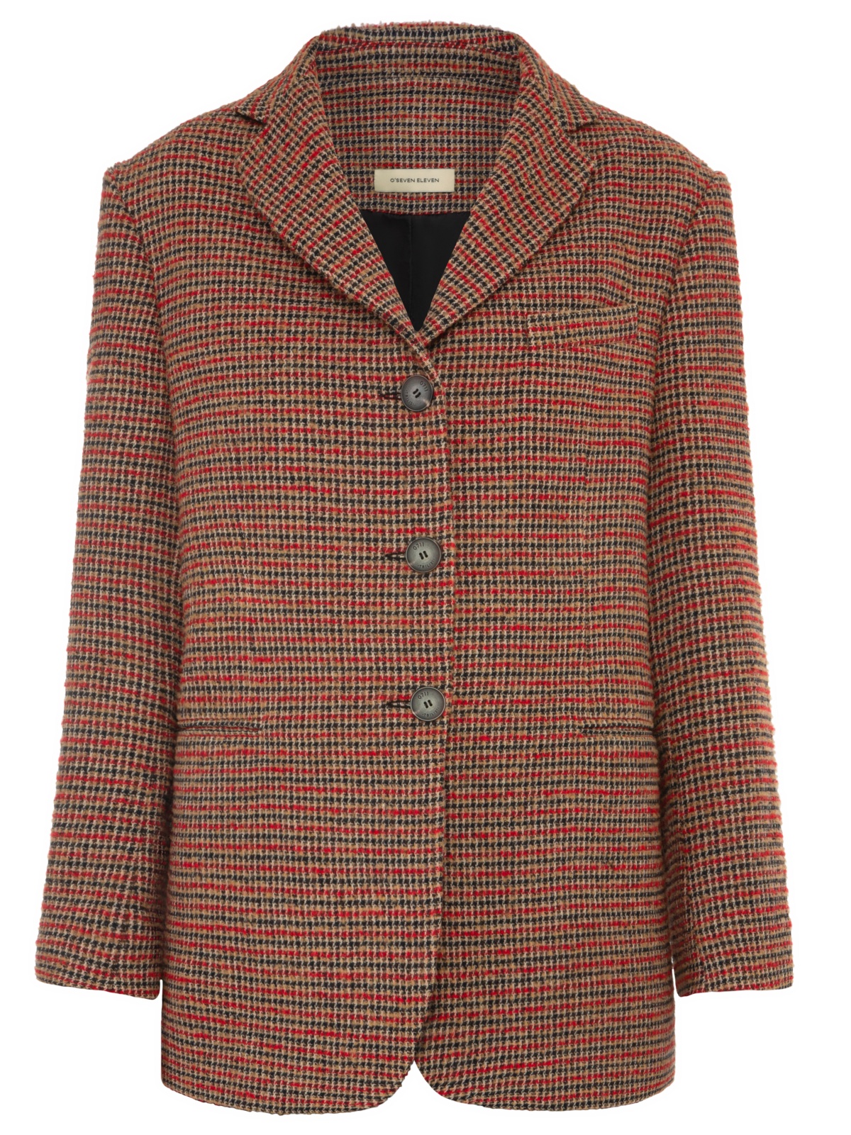 While the silhouette of a red checked blazer is kept precise, it exudes the tactile feel of a boucle to counterbalance sartorial clarity with texture play. The piece fits slightly oversized to make layering an easy feat and features peak lapels along with slit pockets and single-breasted fastening that opens into a satin-lined interior.