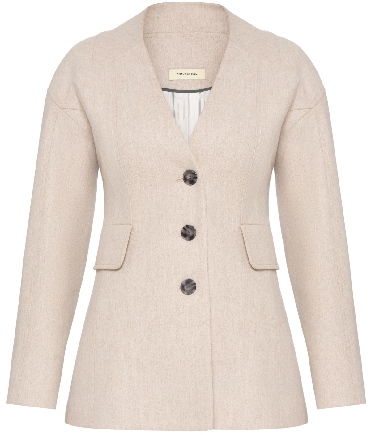Inherently elegant oatmeal collarless blazer comes along with an architectural approach - evident in sharp tailoring and slimline paneled profile. Featuring a fully lined interior along with flap pockets and single-breasted closure, the structured silhouette of the piece is balanced by sumptuous cashmere-blend fabrication.