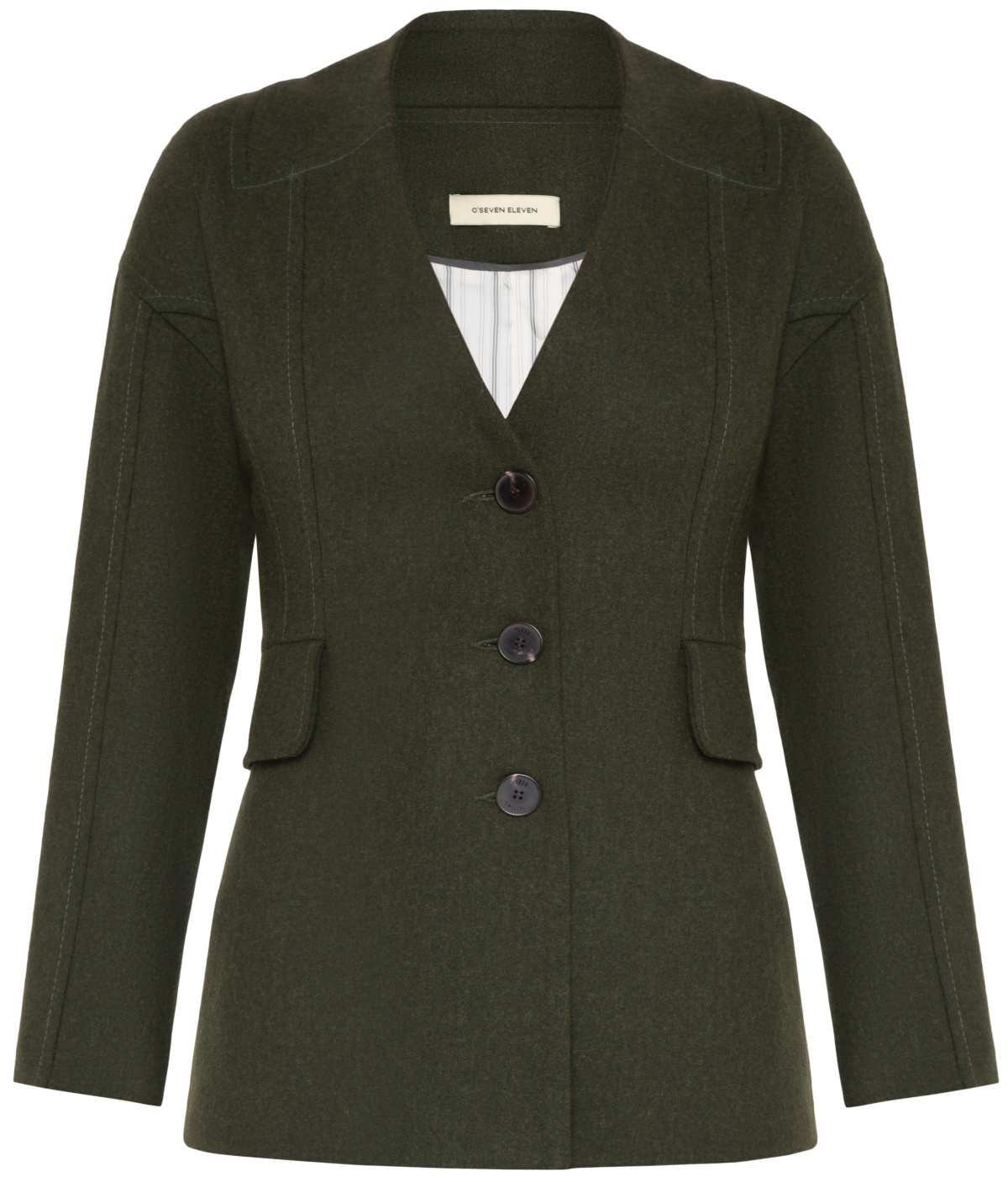 Inherently elegant khaki collarless blazer comes along with an architectural approach - evident in sharp tailoring and slimline paneled profile. Featuring a fully lined interior along with flap pockets and single-breasted closure, the structured silhouette of the piece is balanced by sumptuous cashmere-blend fabrication.
