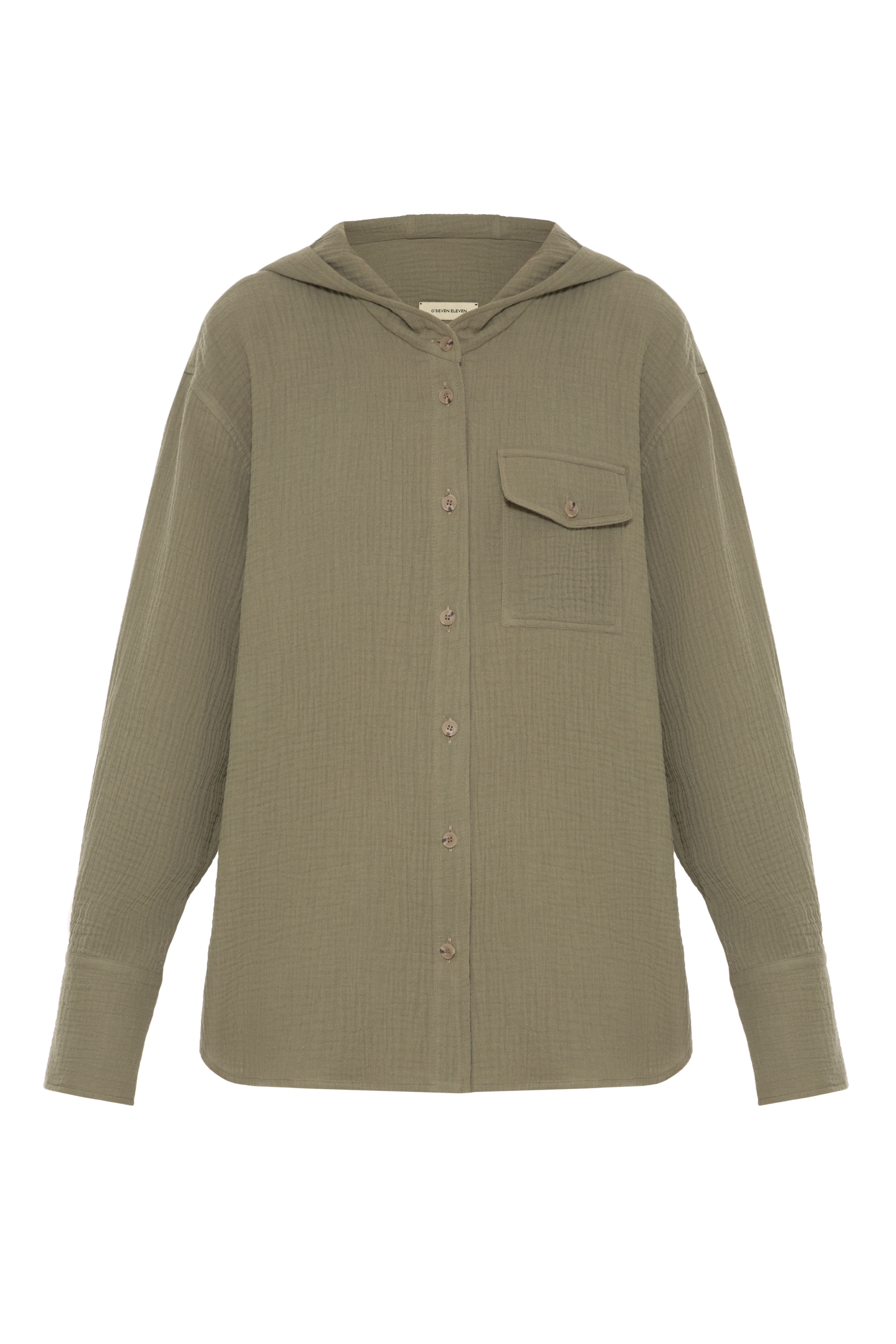 With a hood added, O'SEVEN ELEVEN offers a less predictable option of a classic shirt. Swapping crisp fabrication for a double gauze cotton to enhance tactility, the piece is defined with a front patch pocket and features a long sleeve silhouette and is defined along with a button placket.