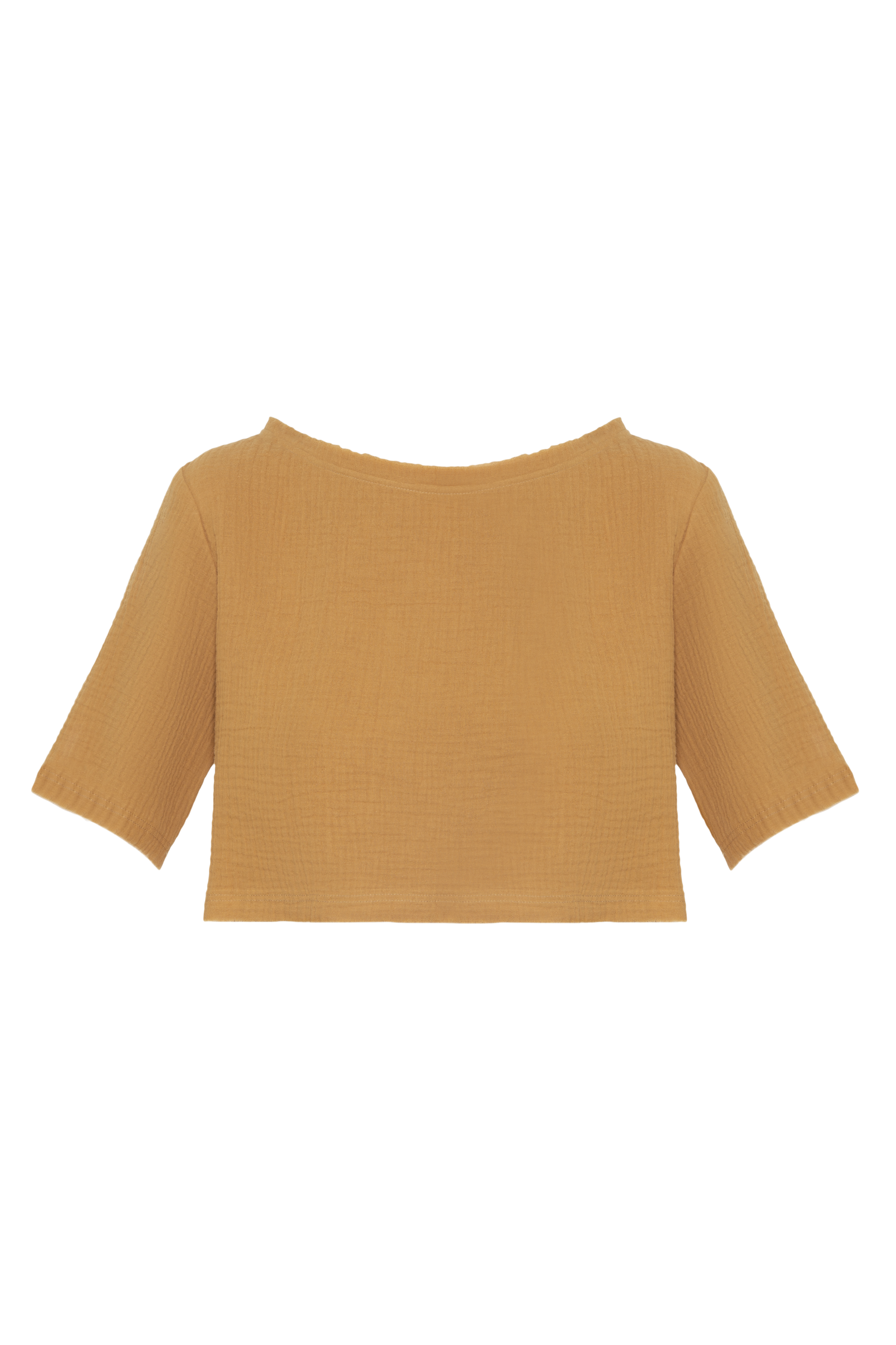 Camel Cropped Top from O'SEVEN ELEVEN is imbued with carefree summer energy. Imagined in breathable double gauze cotton to up warm weather suitability, the piece is cut to have a slightly loose fit and features a crew neckline along with the raw hems to emphasize a laid-back attitude.