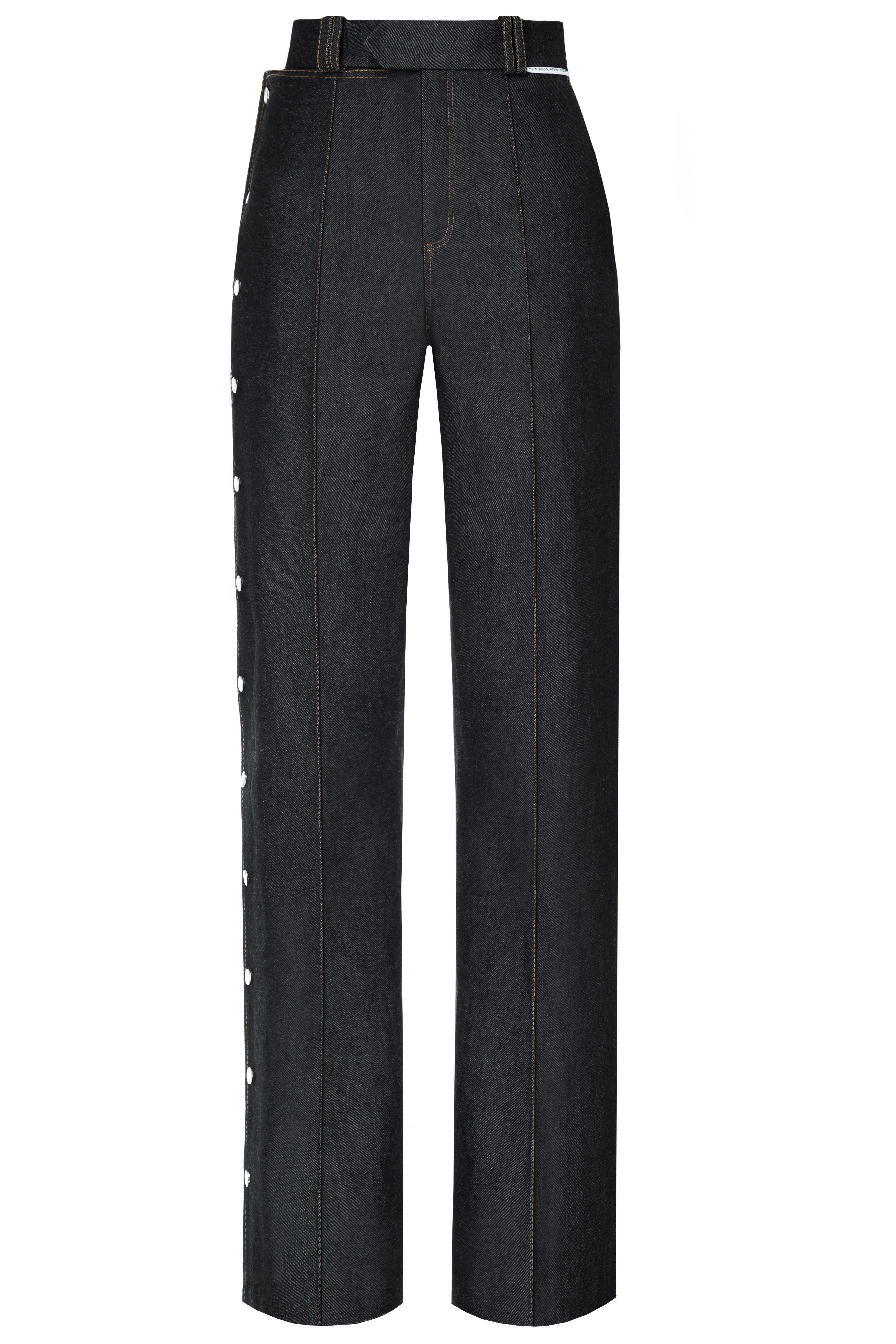 Aleksandre Akhalkatsisvili’s creations are eye-catching due to the designer’s slightly nonconformist taste level, which is perfectly demonstrated by Grey Denim Trousers. Overlooking the classic straight-leg silhouette, the piece fastens with a concealed zipper and features a snap button row which can be undone to show a dose of skin.