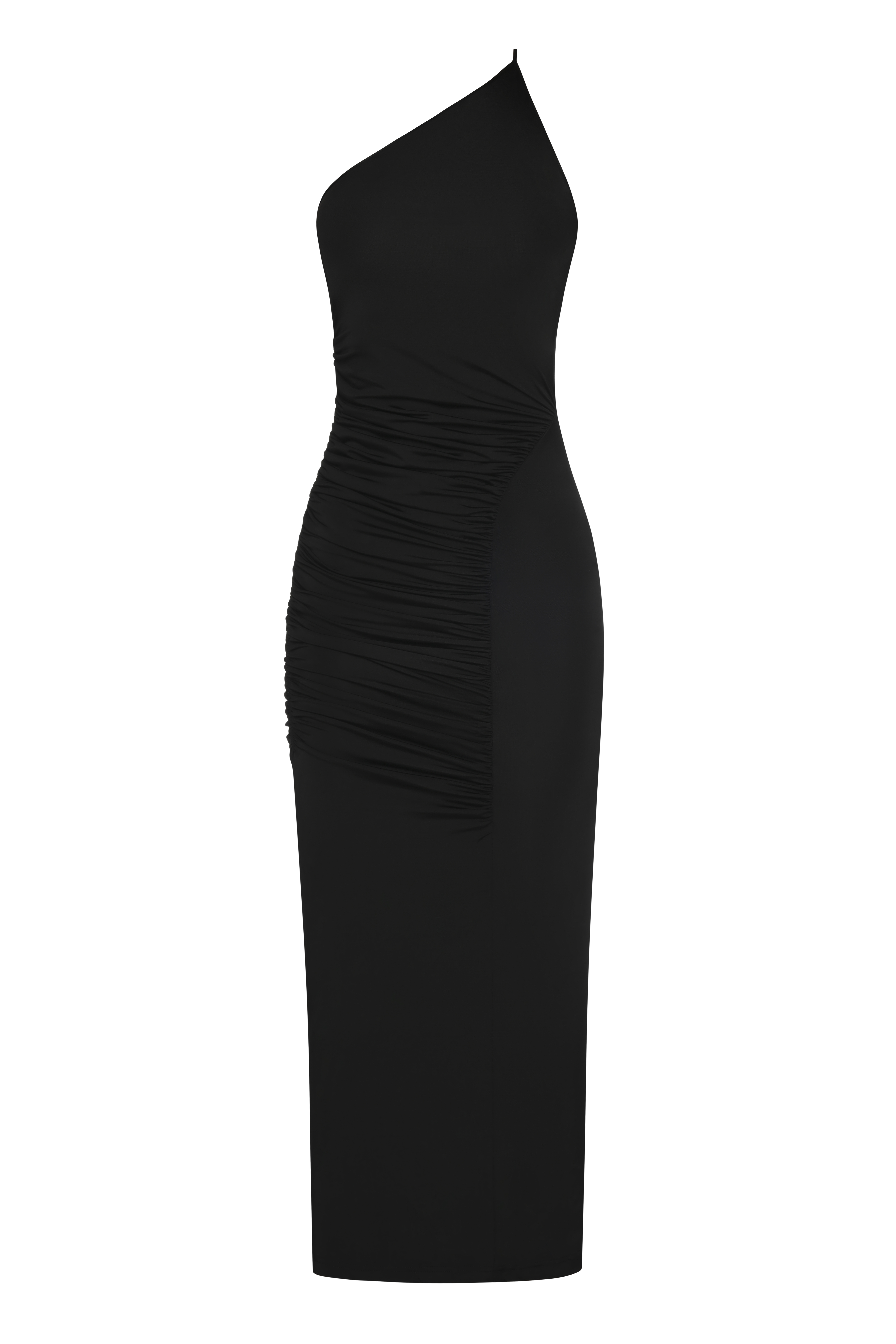 Black Gathered Midi Dress from Materiel emphasizes the label's penchant for body-conscious profiles. Crafted from fluid jersey, This one-shouldered piece is cut for a body-hugging fit and features a crew neckline along with the tie closure and a side ruche which brings a further dimension to the otherwise minimalistic silhouette.