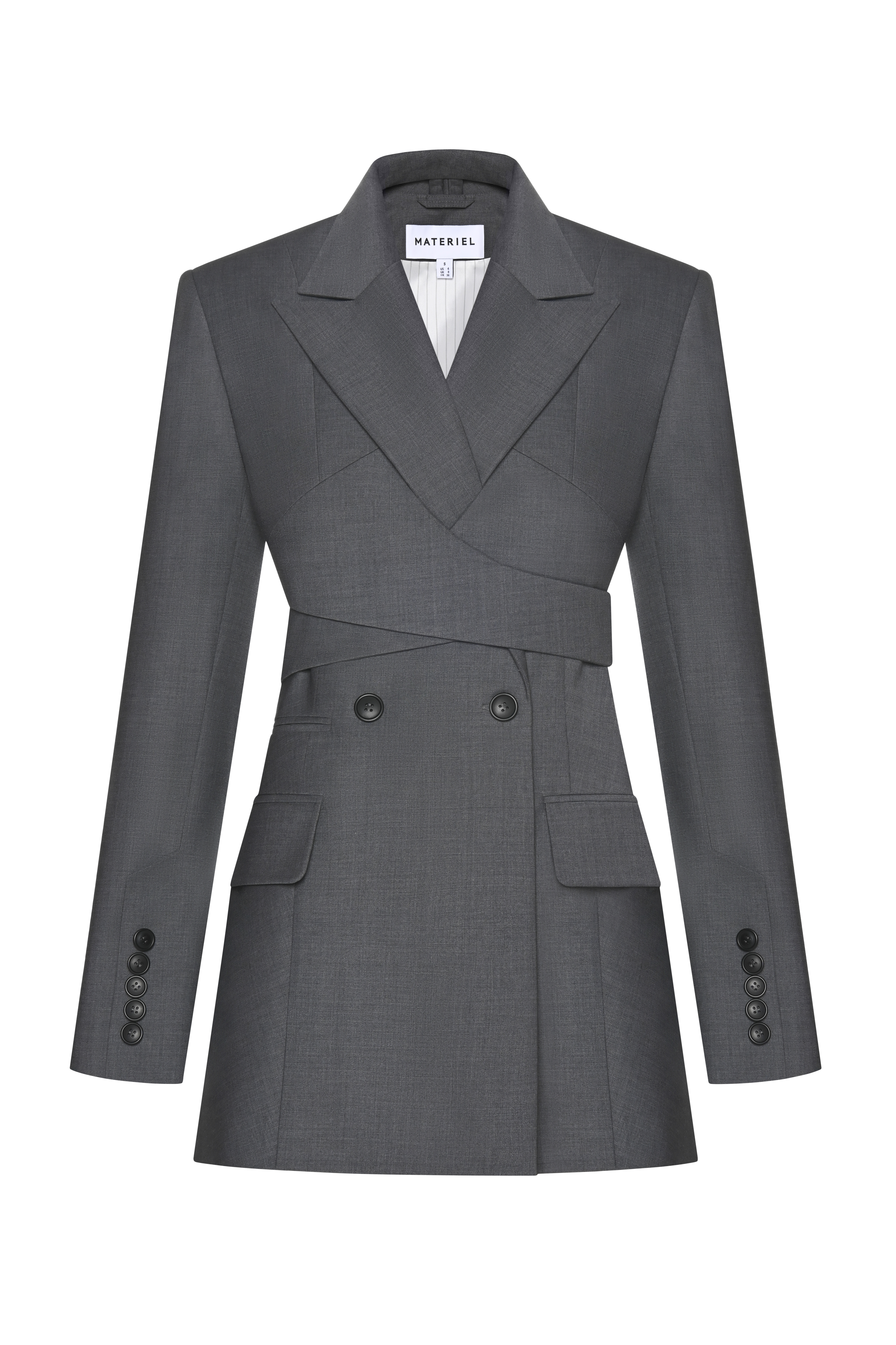 Grey Layer On Blazer showcases Materiel's design philosophy that threads a line between functionality and fashion-forward elements. Meticulously tailored into a slim fit silhouette and featuring classic sartorial nuances such as double breasted closure, peak lapels, notched lapels and welt flap pockets, the piece is more than it seems - it is deconstructed to separate into a bolero and a backless waistcoat.