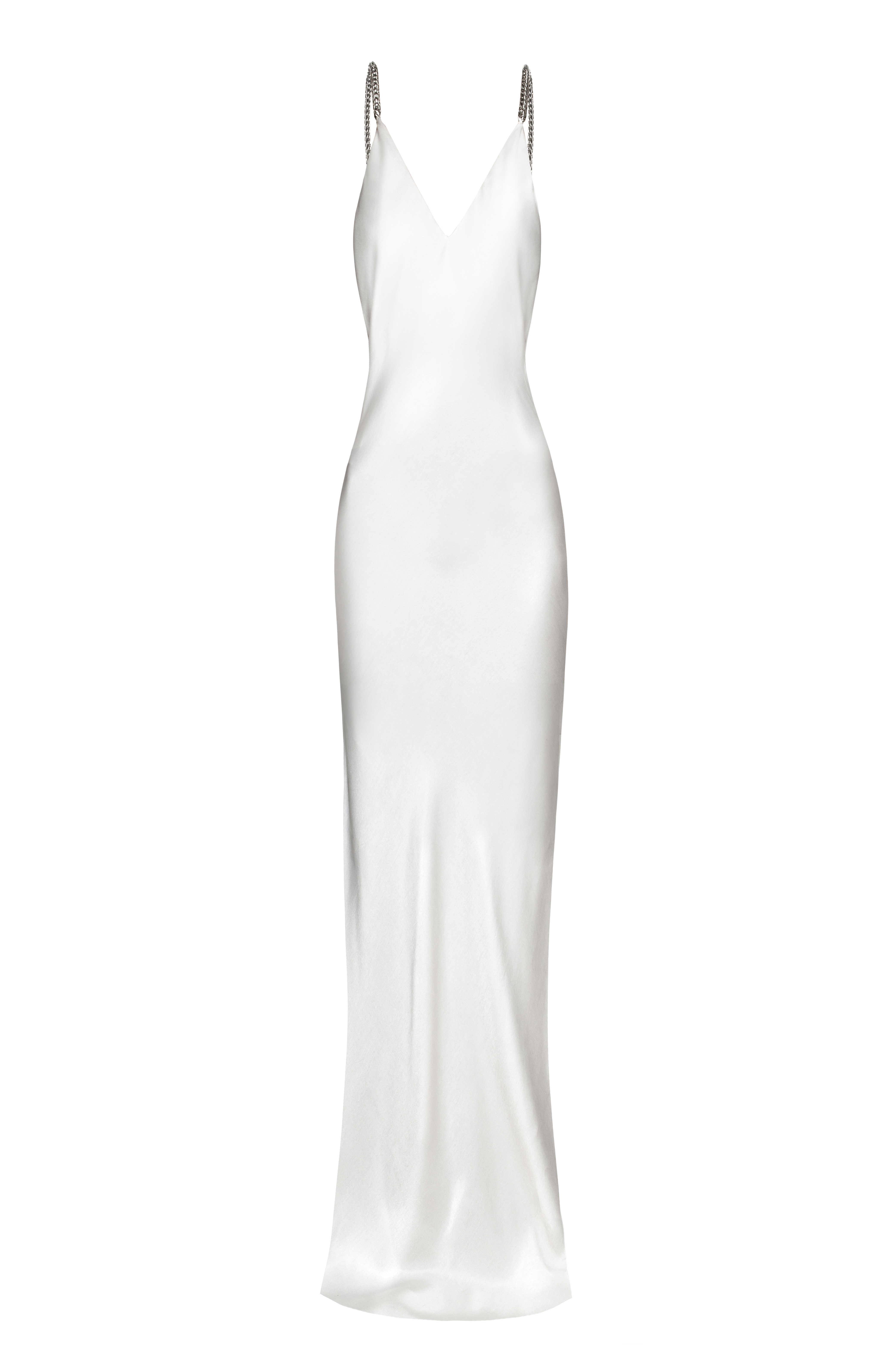 For Spring/Summer 2024, Aleksandre Akhalkatsishvili returns with a multitude of updates to his hyper-cool, effortless sensuality. One of the notable pieces is White Maxi Slip Dress - featuring a backless profile and a slimline fit. The piece is double lined to provide a full coverage and is accented by chunky chain straps to offset fluid cupro fabrication with a dose of edginess.