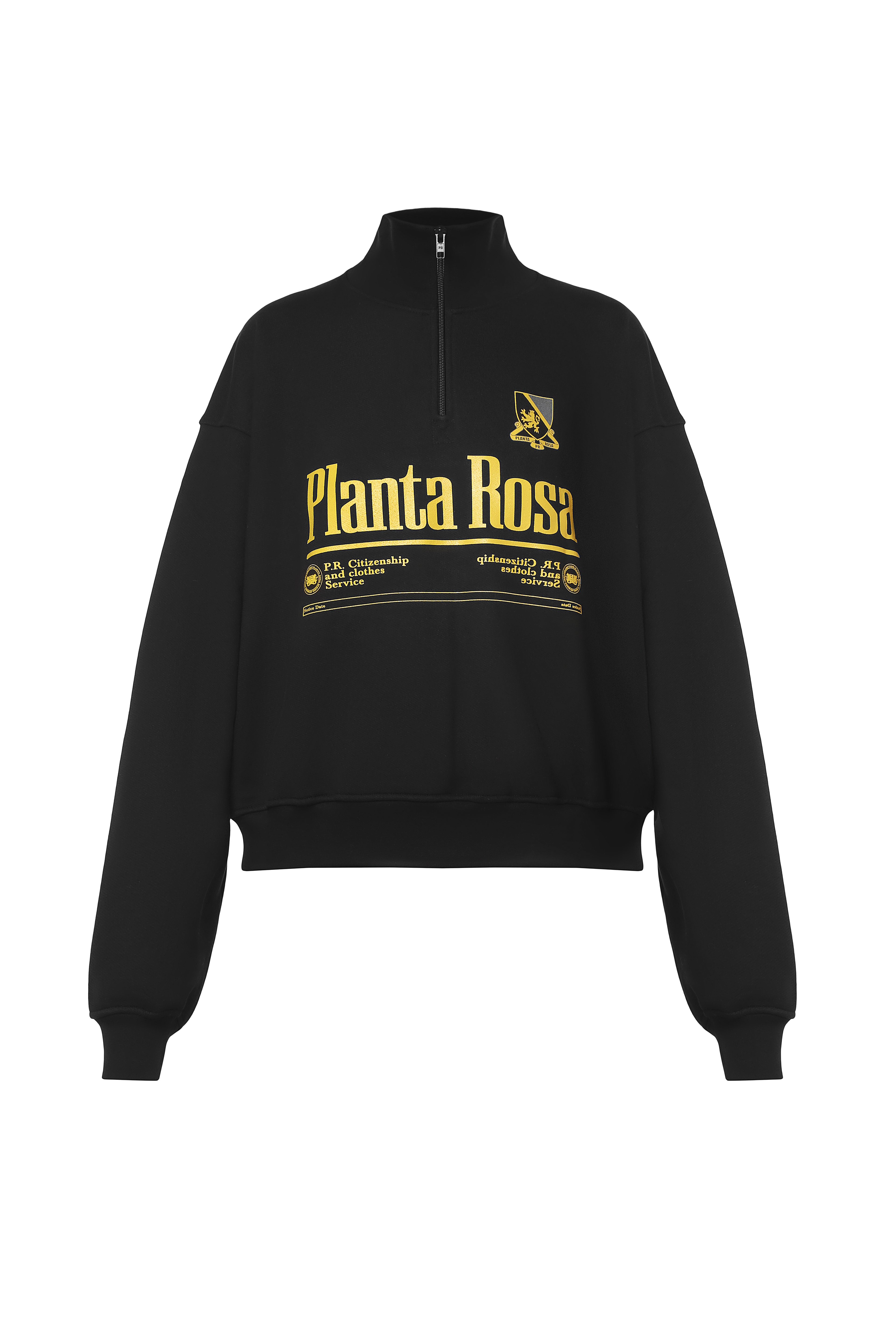Established with an ethos to resurrect beloved vintage silhouettes, Planta Rosa offers a considered selection of retro profiles with a contemporary spin. A part of the above-mentioned selection, Black Anorak Features a classic half-zip design and long drop sleeves. Cut for an oversized fit, the piece is animated with a contrast logo print while its soft cotton fabrication intends to ensure a comforting feel.