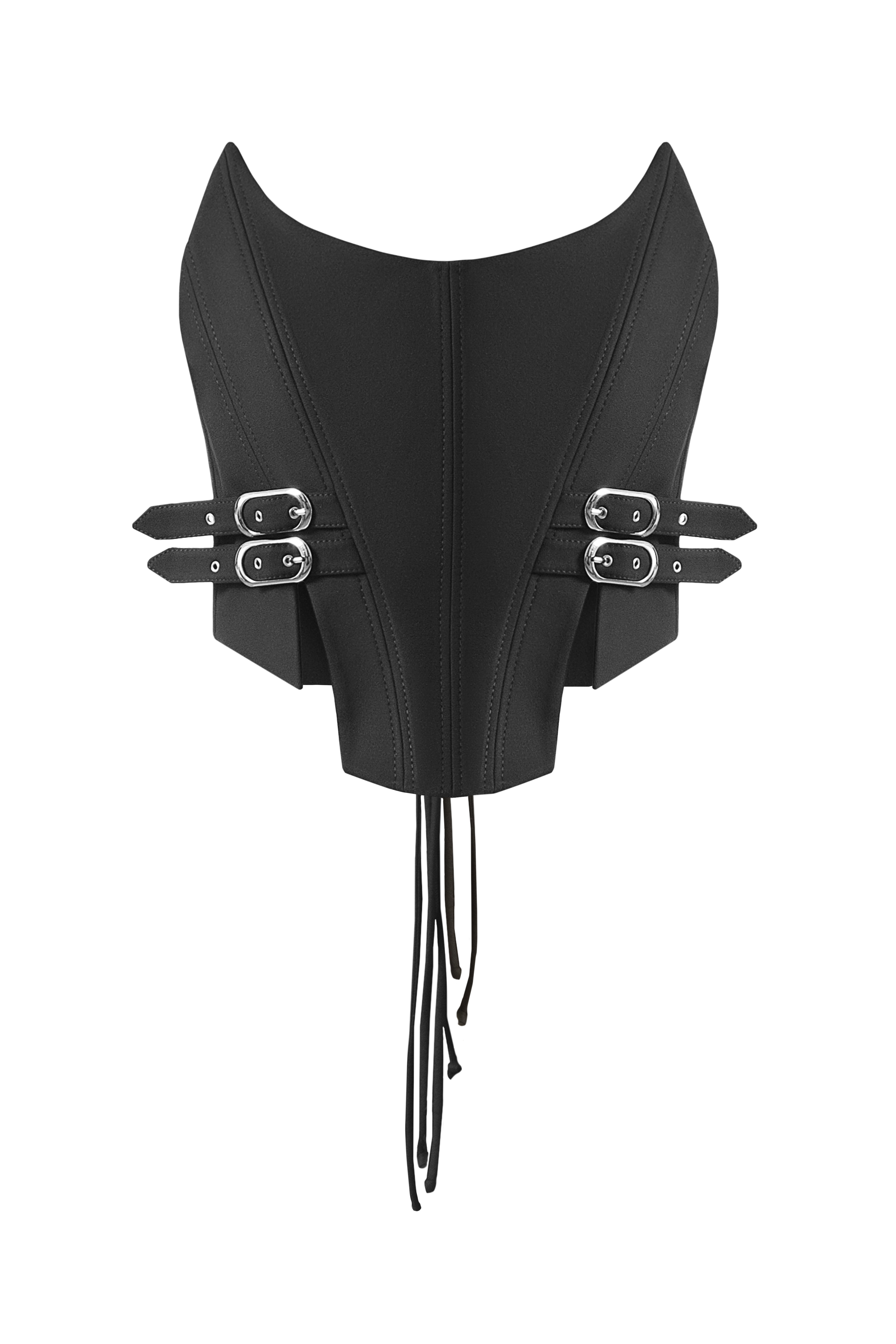 This striking corset from Aleksandre Akhalkatsishvili in black showcases a bold design with sleek double belts on the sides. It features dramatic cutouts and lace-up ties at the back, adding a touch of sophistication and edge to the overall look.