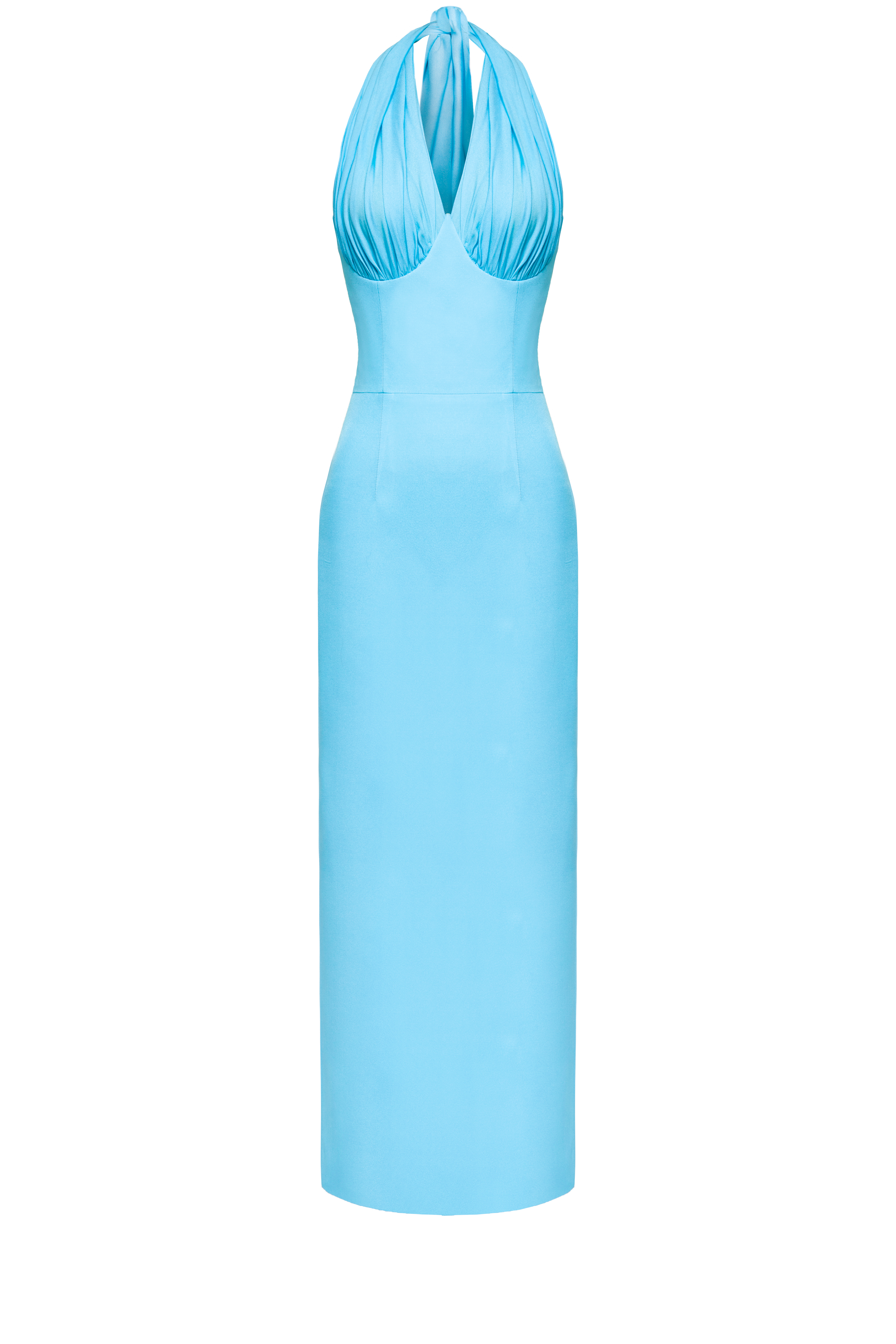 This elegant scarf dress is designed to make a statement. It features a flattering V-neckline and a straight hem for a clean, sophisticated silhouette. The back concealed zip fastening ensures a seamless fit, while the flowy scarves cascading along its length add a touch of drama and movement. The vibrant turquoise blue hue enhances its modern appeal, making it a perfect choice for standout occasions.