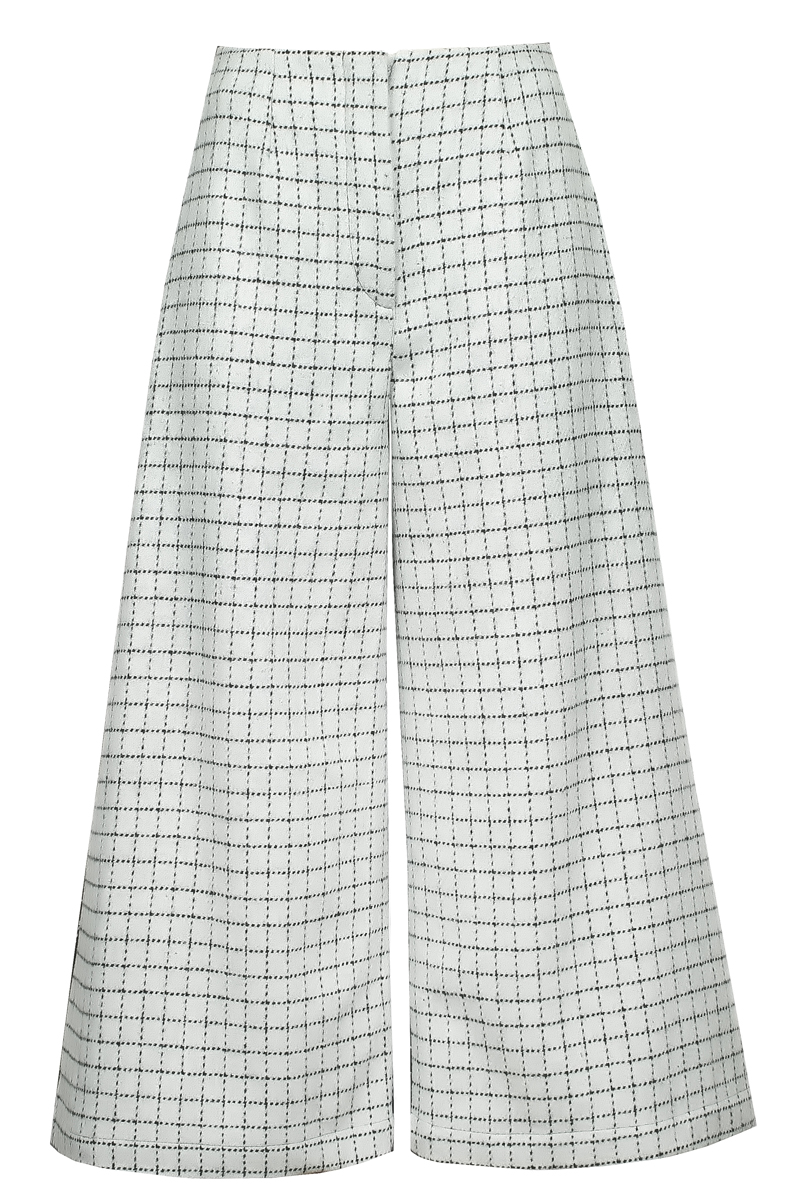 Light grey and charcoal checkered two tone high-waisted culottes with hidden zip at the front.