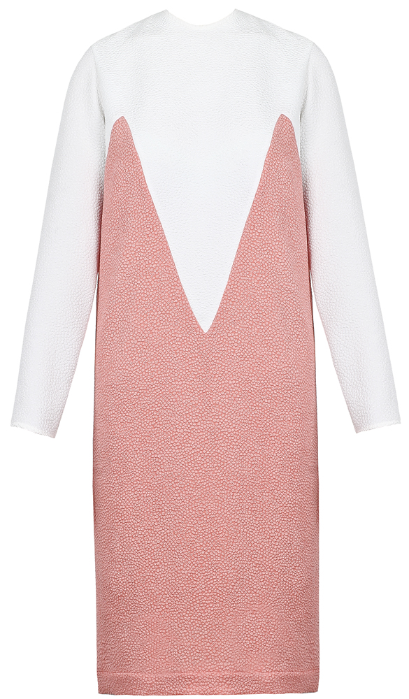 Ivory and coral color block bubble jacquard dress, with wrap around panelling and hidden zip at the back.