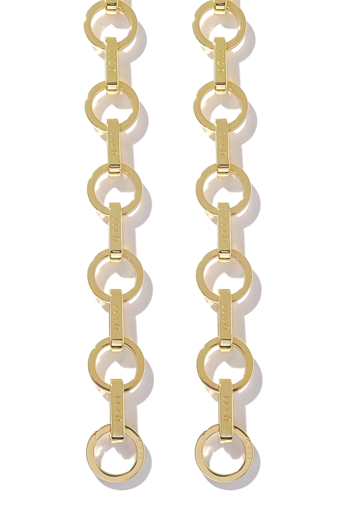 Monogrammed gold chain strap with engraved logo hardware. Can be worn and used as a belt.