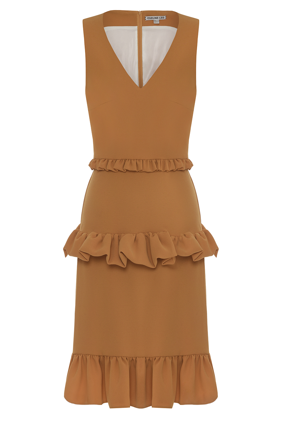 Mustard fitted short V-neck dress with sleeveless design, cascading ruffled trims and hidden back zip.