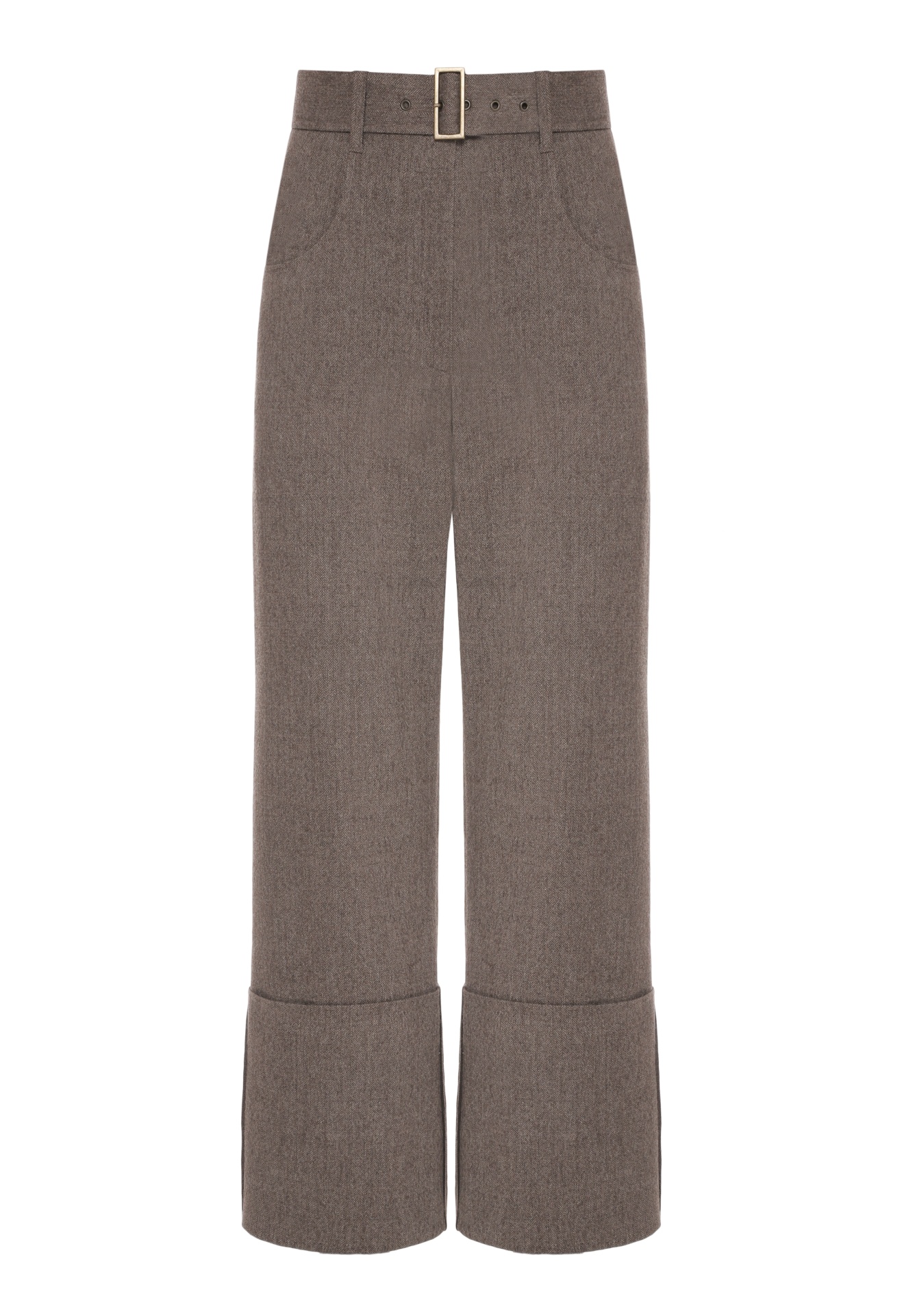 Brown wool blend cropped, high-waisted, wide-leg, fully lined pants with side pockets, detachable belt and turned up hem.