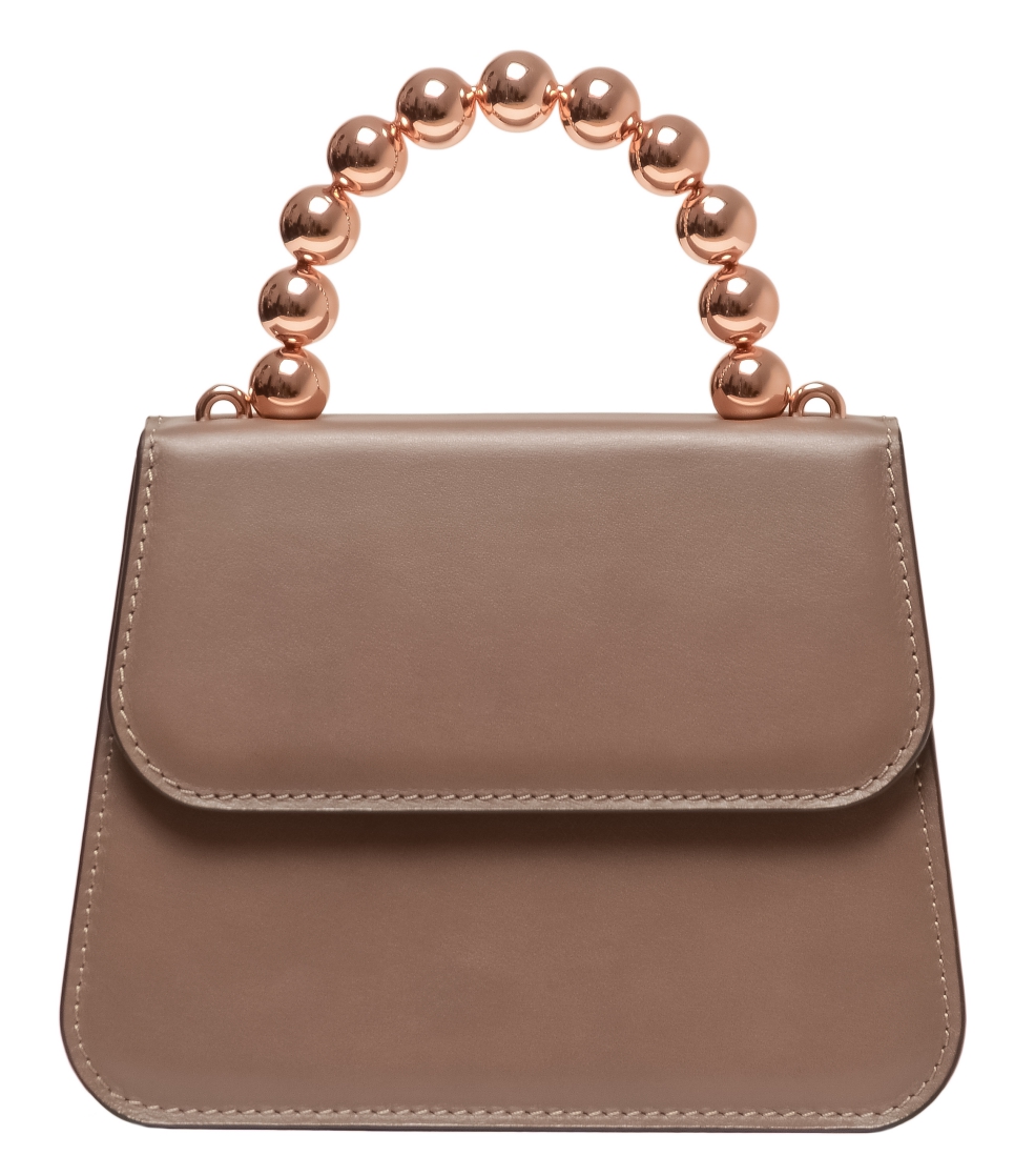 Coffee flap purse with soft corners, rose gold ball handle, inside pocket and removable leather strap with rose gold hardware.