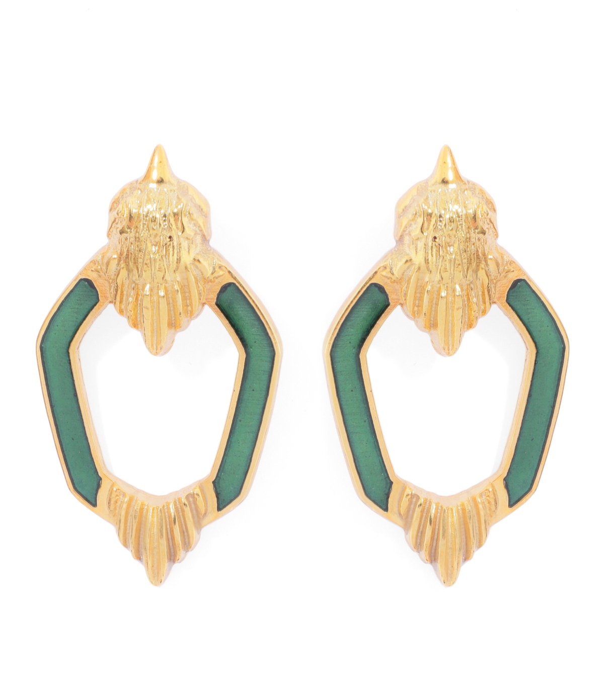 Gold plated bird earrings with green enamel and sterling silver push-back fastening.
